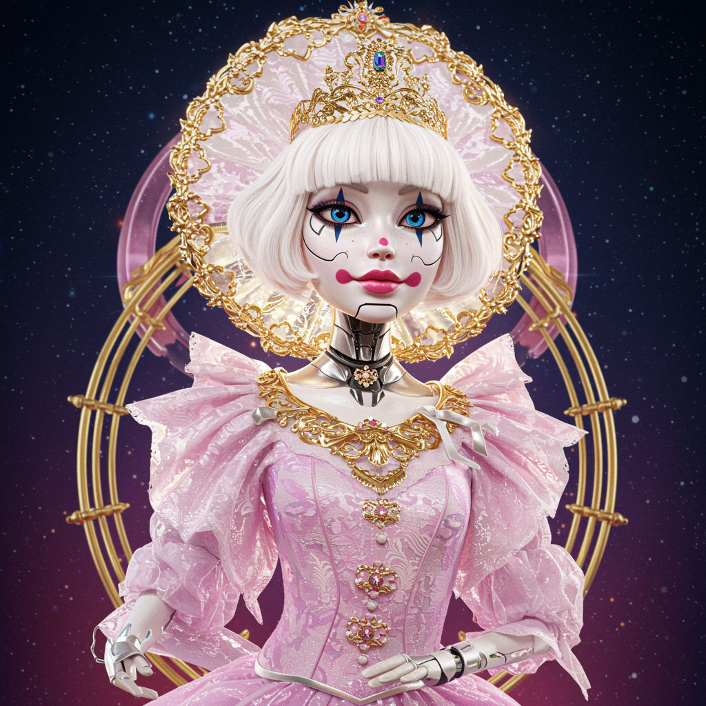 Pixar-inspired 8k portrait of an exquisite, radiant white galactic prima ballerina with a clowncore twist; a young Russian cyborg college girl embodying opulence. Features the golden ratio in her intricacies, set in a sci-fi fantasy cyberpunk universe. Highly intricate and lavish, this digital painting evokes Ever After High aesthetics with an octane-rendered, smooth, sharp focus. A concept art piece reminiscent of works by Artgerm, Loish, and WLOP, blending fantasy and technology into an enchanting, dream-like illustration.