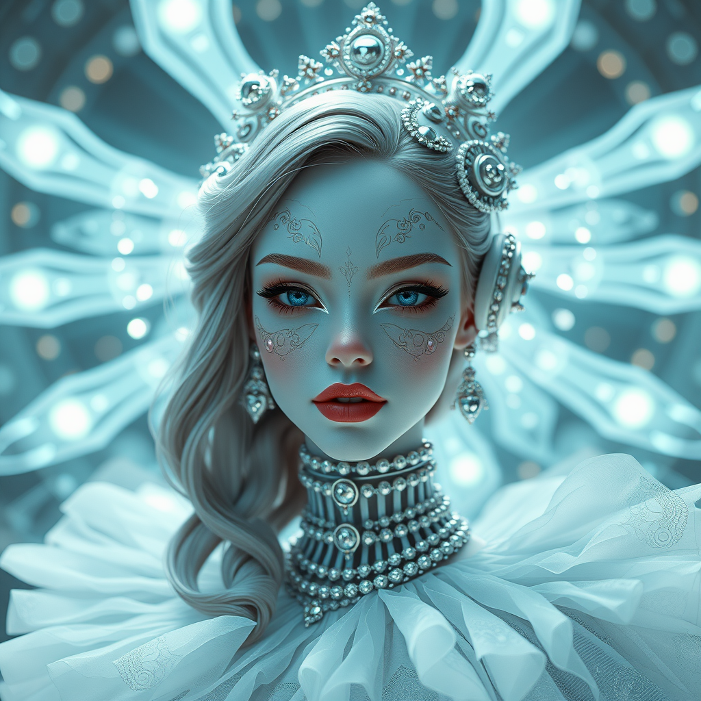 pixar-inspired 8k portrait, stunning luminous white affluent celestial ballerina with clowncore elements, Russian cyborg university student, golden ratio features, blending sci-fi with fantasy and cyberpunk aesthetics, lavish and intricately detailed digital artwork, reminiscent of ever after high, rendered with octane, suitable for artstation, a refined concept art with smooth sharp focus, reminiscent of works by artgerm, loish, and wlop, achieving a harmonious fusion of styles.