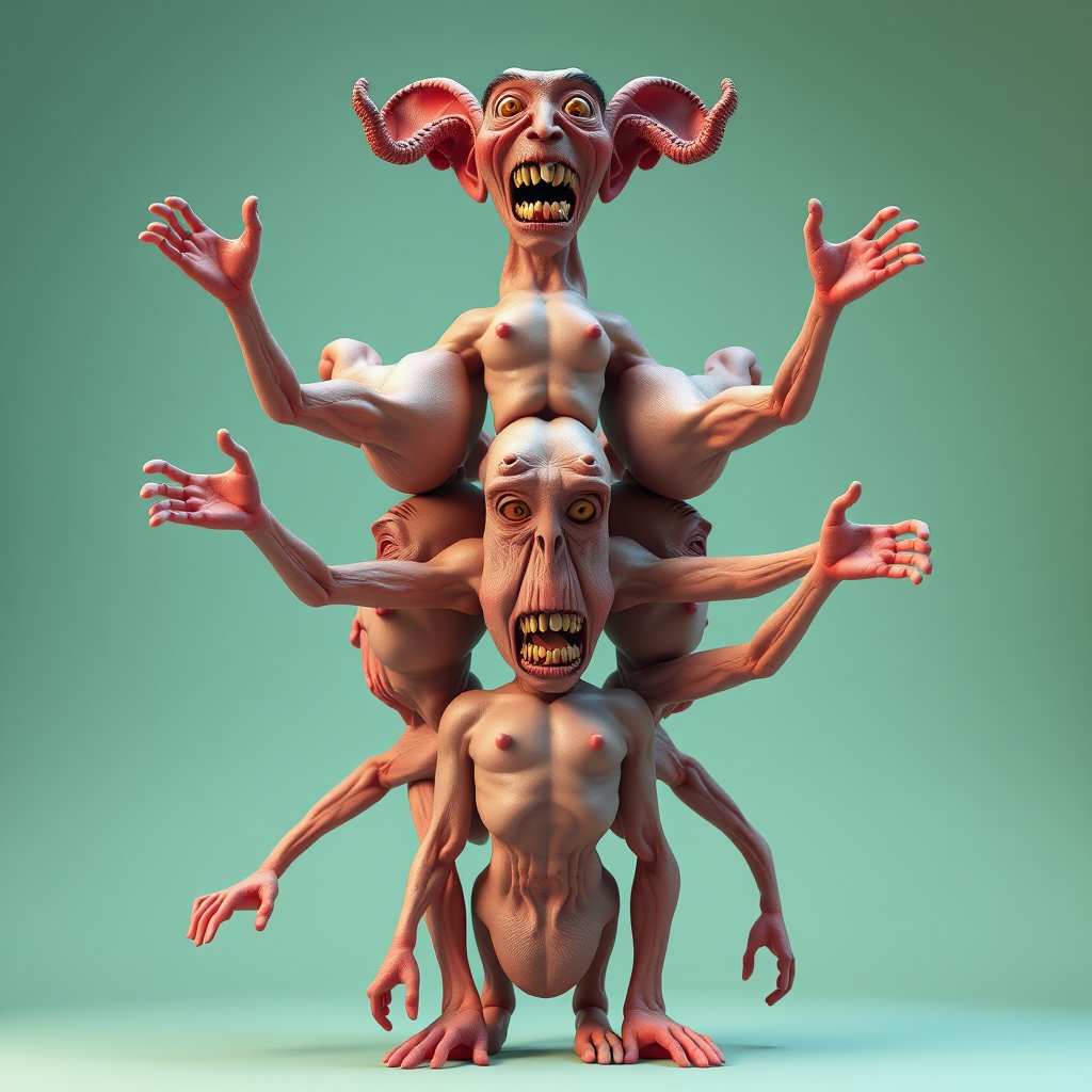 Pixar-inspired creation with pastel colors and realistic lighting and shading, featuring a dynamic pose with high-quality, ultra-detailed 3D render utilizing C4D, octane render, and ray tracing in 8k resolution. The scene includes uniquely stacked torsos forming a totem pole, showcasing intentionally bizarre anatomy with extra, missing, or floating limbs, creating a surreal and mutant appearance. Elements of poorly drawn features contrast with highly detailed textures, adding an artistic touch of oddity and blur to evoke a sense of unusual and captivating beauty within the distortions.