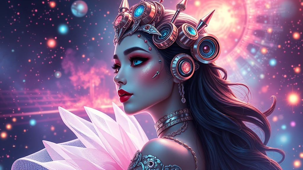pixar-inspired high-resolution portrait of an elegant and radiant galactic ballerina with a clowncore twist, depicting a Russian cybernetic college girl with intricate and opulent features, embodying the golden ratio; a fusion of sci-fi, fantasy, and cyberpunk elements, beautifully detailed digital painting with influences from ever after high aesthetics, rendered with octane quality, suitable for artstation concept art, showcasing smooth and sharp focus, capturing the artistic styles of artgerm, loish, and wlop.
