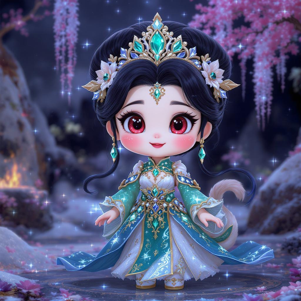 Pixar-inspired lifelike character featuring a Chinese-style design with a super cute appeal. The character is adorned with an emerald crown and a royal costume embellished with gold accessories, showcasing intricate metal work. They possess captivating red eyes and a cute tail, with delicate hands and feet adding to their charm. The costume is richly detailed with numerous crystal flowers, enhanced by a moonlight effect for a magical touch. The scene captures an ultra HD panorama with complex details, creating a beautiful and enchanting atmosphere reminiscent of an Aurora. In a full-body shot, the character stands with a joyful smile, exuding warmth and showcasing impressive posture. The image is rendered in vibrant blue with ultra HD quality, ensuring a visually stunning experience.