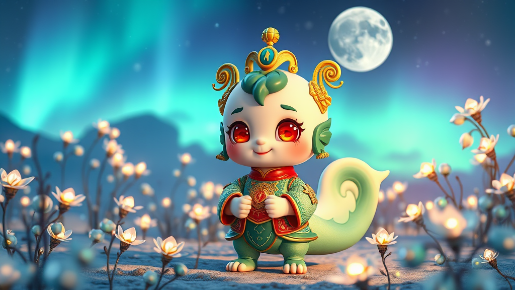 Pixar-inspired realistic character with a Chinese style, super cute features, wearing an emerald crown and royal costume adorned with gold accessories. The character has lifelike elements with intricate metal designs, large adorable red eyes, and a cute tail. Their delicate hands and feet are meticulously detailed, surrounded by numerous crystal flowers shimmering in the moonlight. The scene is bathed in a beautiful Aurora with a panoramic view, showcasing the character in a full-body shot as they stand and smile happily. The lighting enhances the scene with a soft, safe glow, all captured in stunning blue Ultra HD quality with complex details, creating a captivating and enchanting visual experience.