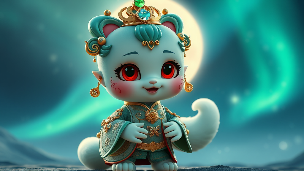 Pixar-inspired, realistic Chinese style character with a super cute appearance, adorned with an emerald crown. The character wears a royal costume featuring gold accessories and intricate metal designs. They have red, expressive eyes and a charming tail. Their hands and feet are delicate, showcasing super detailed craftsmanship. The attire is embellished with numerous crystal flowers, reflecting the subtle glow of moonlight. The scene captures the essence of a lifelike image in ultra HD, highlighting complex details and breathtaking beauty. The setting is enhanced with an Aurora backdrop, offering a panoramic view of the full body shot. The character stands with a joyful smile, bathed in soft, safe light. The overall visual is rendered in blue Ultra HD quality, capturing every detail in 16K resolution.