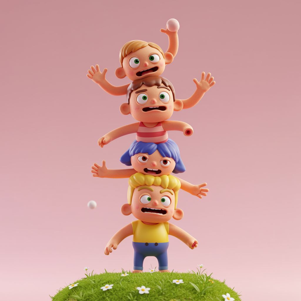 View this AI-generated image featuring pixar inspired 3d render in pastel colors with natural realistic lighting and shading featuring a dynamic pose and ultra high detail this imaginative scene includes a whimsical totem pole of stacked figures with unconventional anatomy showcasing extra and missi