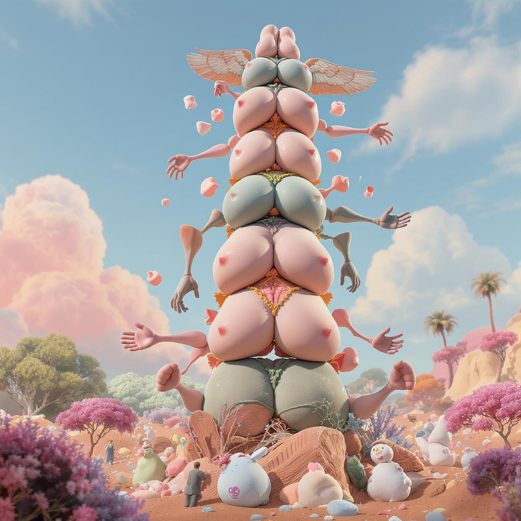 Pixar-inspired scene with pastel colors, featuring natural and realistic lighting, dynamic poses, and ultra-detailed 3D render in Cinema 4D using Octane Render with ray tracing for 8k resolution. The composition includes a series of stacked torsos forming a totem pole, characterized by intentionally poor and wrong anatomy, with extra, missing, floating, and disconnected limbs for a surreal, mutated, and abstract appearance. The scene combines both beauty and distortion, blending realistic elements with exaggerated, ugly, and grotesque anatomy for a unique and artistic vision.