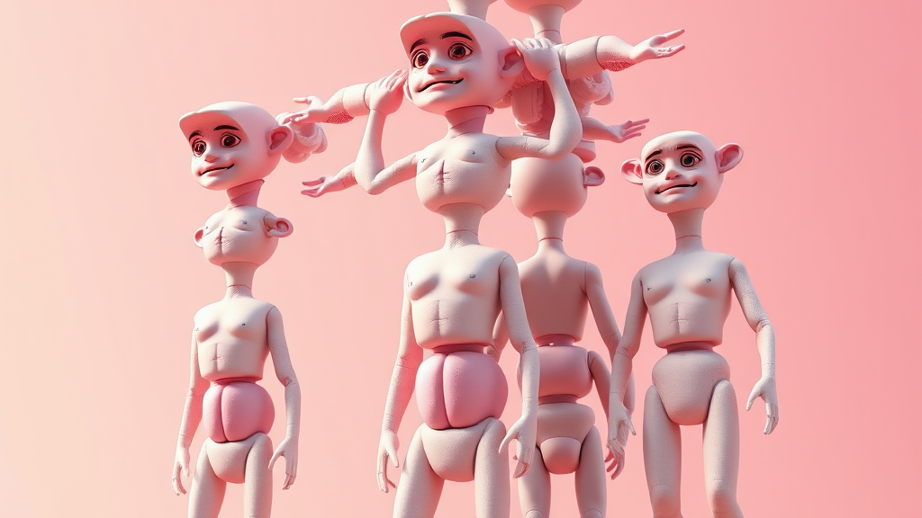 Pixar-inspired, soft pastel colors, featuring natural and realistic lighting and dynamic posing, showcasing high-quality ultra-detailed 3D render with advanced shading. Rendered using C4D and Octane with ray tracing in 8k resolution. Imagery includes an abstract interpretation of interconnected figures resembling a totem pole. The composition plays on surreal anatomy with unconventional artistic interpretations such as stacked torsos, misplaced or missing limbs, creating a mutated yet intriguingly abstract form. While focusing on unique shapes and forms, the scene explores themes of mutation and transformation, with disjointed elements, conveying a blend of creativity and absurdity, enhanced by high detail and clarity.