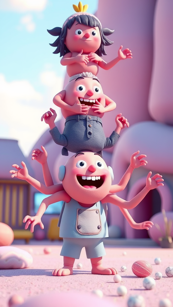 Pixar-inspired vibrant pastel colors, realistic natural lighting, dynamic poses, high-quality ultra-detailed 3D render with Cinematic 4D and Octane render technology, featuring ray tracing and an 8k resolution. Depict a whimsical scene with stacked characters resembling a totem pole, where anatomy is creatively exaggerated with extra limbs and floating limbs, creating a playful yet surreal aesthetic. The depiction embraces artistic mutation, with disconnected limbs forming an intriguing and dreamlike narrative, maintaining an abstract beauty amidst intentional anatomical inaccuracies, slightly blurred for atmospheric effect.