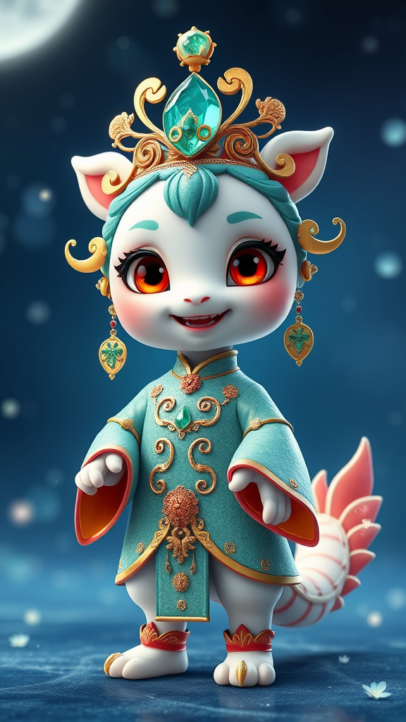 Pixar-style realism featuring an adorable Chinese-inspired character adorned with an emerald crown. They wear an exquisite royal costume featuring intricate gold accessories and lifelike metal designs. Their captivating red eyes and charming tail enhance their endearing appearance. The character's delicate hands and feet are depicted with remarkable detail, and their ensemble is embellished with a multitude of crystal flowers that catch the moonlight. The scene is bathed in a soft aurora glow, capturing the full body in a panoramic view. The character stands with a joyful smile, exuding warmth and positivity. The high-definition portrayal showcases ultra-HD complex details and breathtaking beauty, set against a background of serene blue hues, ensuring visual appeal with advanced safety lighting effects.