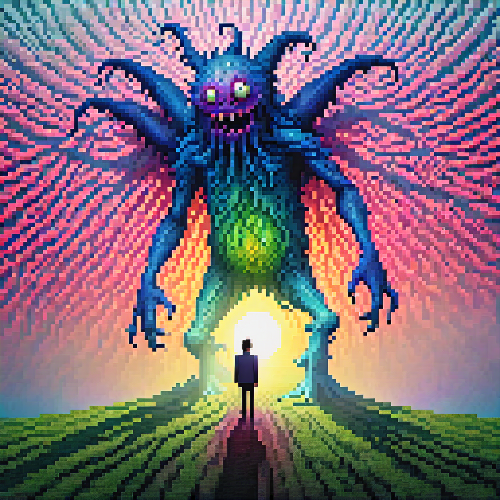 (pixel art), photography in the style of detailed hyperrealism, fantasy, (monster:1.3), Gabriel Dawe, Gilbert Garcin ,AES+F, hyper detailed, intricate, poster, ArtStation, subsurface scattering, Photorealistic, Hyperrealistic, analog style, realistic, film photography, soft lighting, heavy shadow