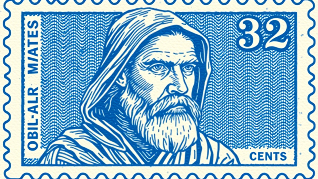 Pixel art vintage United States 2 cent postage stamp featuring Obi Wan Kenobi, rendered in blue ink with line engraving and intaglio techniques, high dynamic range, incorporating SAI Pixel Art style, subtle creative variations maintaining the essence.