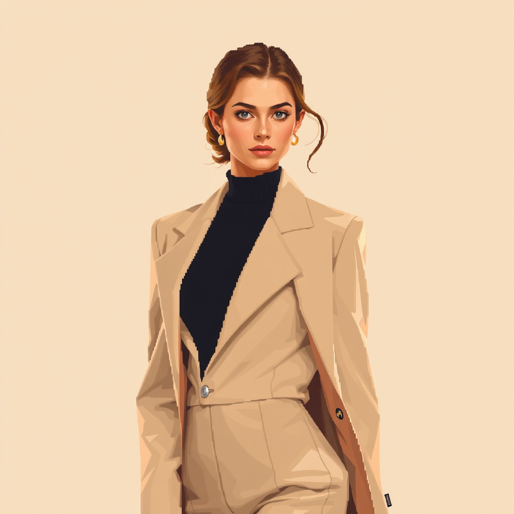 Pixelated elegance portrait, high-fashion mood, luxury brand essence, warm beige palette, slender figure, --ar 4:5