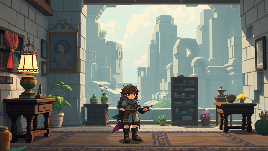 Pixelated fantasy art with a retro charm, inspired by Octopath Traveler's art direction, featuring a hyperdetailed and clean interior scene captured with a 100 mm lens effect for a cinematic feel. The scene should be meticulously crafted, presenting a pixel character in the foreground and a voxel-based background that adds depth and contrast to the image. Embrace the retro aesthetic with a balanced composition and dynamic angles that enhance storytelling. The character should be unique, avoiding typical fantasy tropes, with harmonious proportions and expressive facial features, steering clear of anomalies like extra limbs or disproportionate body parts. Maintain the integrity of the scene with a well-defined thematic border, ensuring every element within the image contributes to the overall narrative.