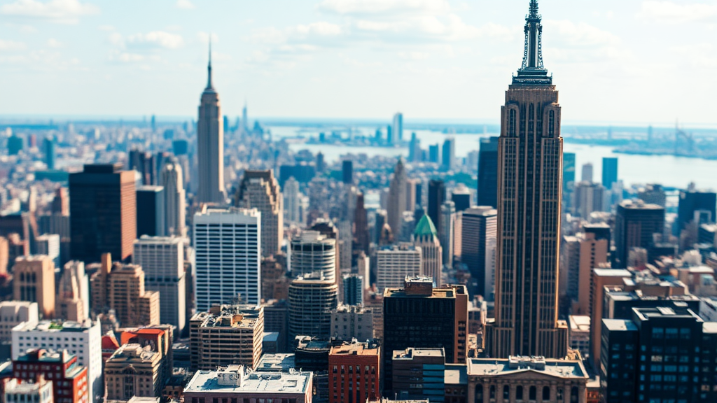 Pixelated retro style, miniature cityscape photography, vibrant New York City skyline with a toy-like appearance.