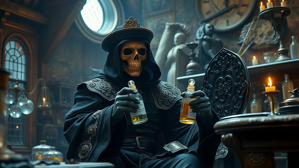 Plague doctor seated in an ancient laboratory, grasping a vial of poison, wearing an intricately designed mask and an ornate black robe adorned with elaborate details. The scene is captured in fantasy art style, featuring high definition and intricate detail, with ambient occlusion casting dynamic shadows and an ethereal glow. The setting is enriched with rough, shimmering textures and enhanced by ray tracing reflections, lumen reflections, and screen space reflections, creating an immersive atmosphere. Diffraction grading adds to the visual richness, as if under a supernova, all presented in breathtaking 8k resolution. Volumetric lighting envelops the scene, casting a mystical aura in a 2:3 aspect ratio, with subtle creative flourishes that maintain the essence of the original vision.