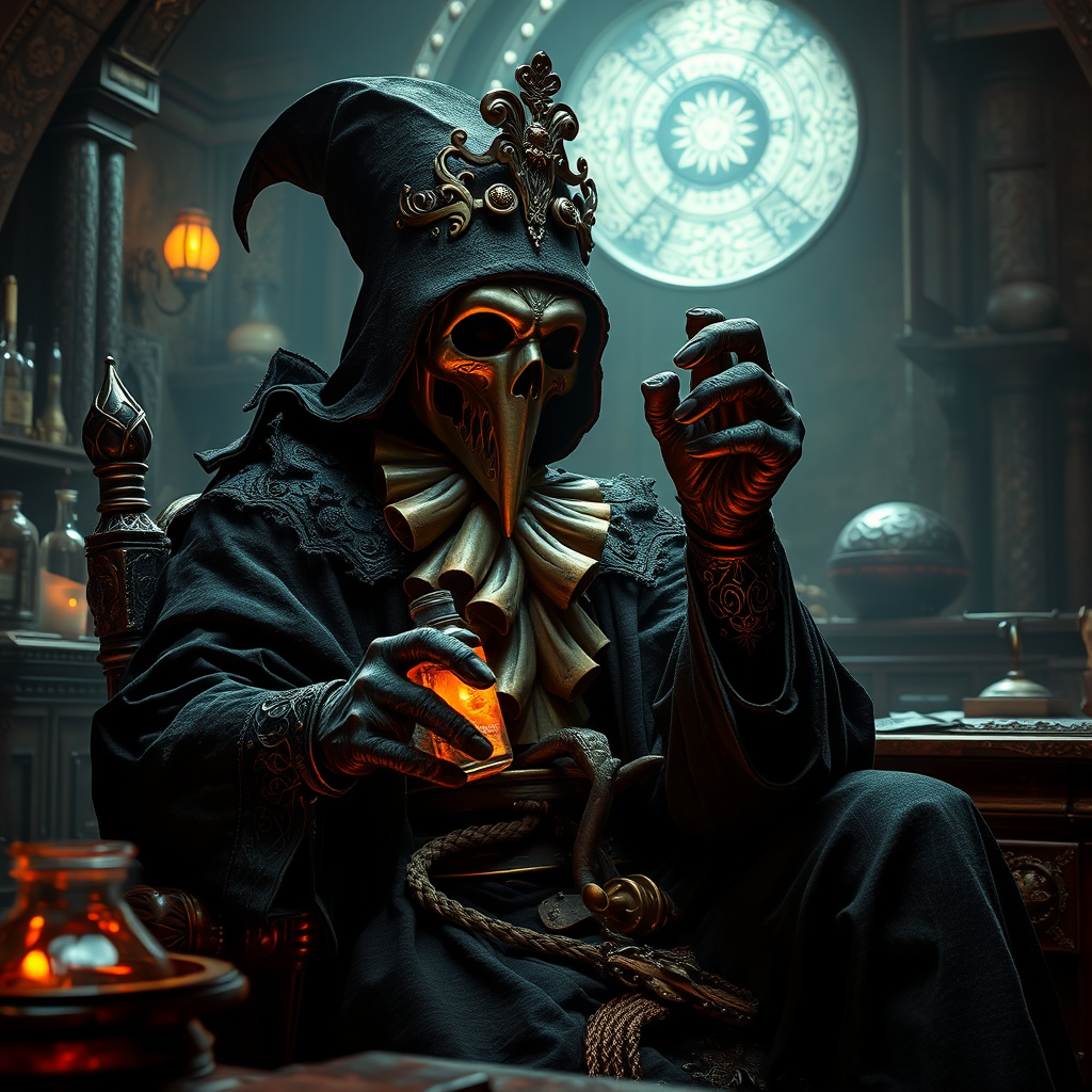Plague doctor seated in an ancient laboratory, gripping a vial of poison, adorned with an elaborately intricate mask and a lavishly designed black robe, richly decorated and finely detailed, set in a fantasy art style, featuring high definition intricacies and dramatic ambient occlusion. The scene is illuminated with glowing light and deep shadows, with textures that are rough yet shimmering. Advanced reflections include ray tracing, lumen and screen space reflections, with diffraction grading adding a mystical touch. A supernova effect enhances the scene, rendered in 8k resolution with immersive volumetric lighting, aspect ratio 2:3.