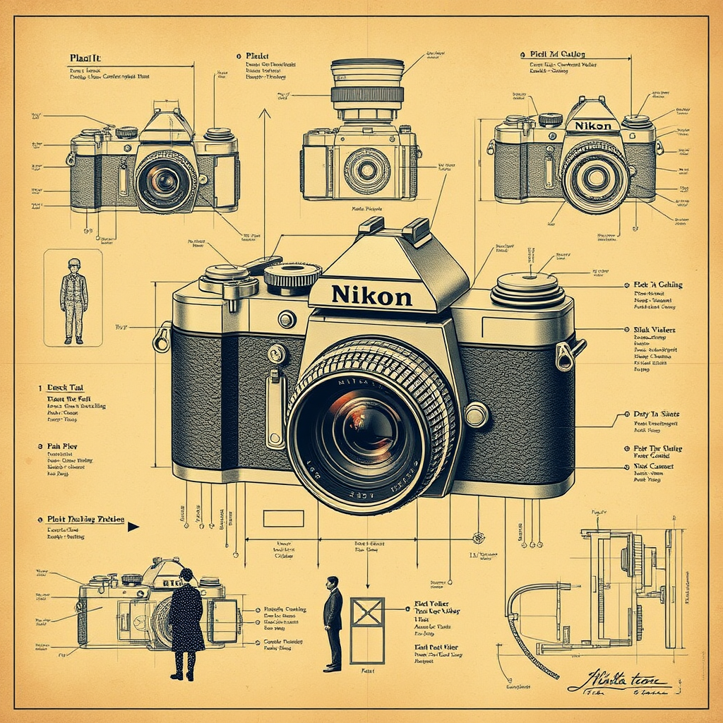 PlanIt features a detailed exploded view drawing of a classic Nikon camera, showcasing intricate dimensions and precise drafting, with various perspectives to highlight its complex construction. BuildIt emphasizes multiple scientific views and highly technical illustrations reminiscent of vintage architectural plans, patent diagrams, and scientific illustrations. This sepia-toned, grain-textured rendering incorporates subtle vignette effects, capturing the timeless character and personality of a timeworn artifact. Interspersed throughout the image are abstract grid elements and occasional glimpses of human silhouettes—a curious man or contemplative woman—integrated seamlessly into the composition, enhancing the camera's narrative and historical context.