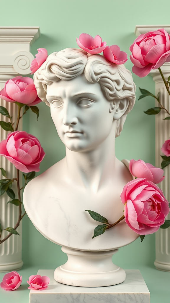 Plaster bust of David adorned with pink peonies, set against a backdrop featuring subtle Doric column details, all on a soft mint green background, aspect ratio 4:5.