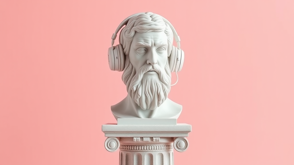 Plaster bust of Goliath's head wearing vintage white headphones, seated atop an Ionic column, set against a pastel quartz pink backdrop -- aspect ratio 4:5, quality level 2.