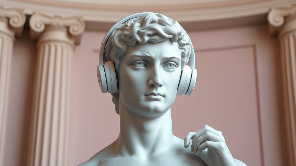 A serene plaster bust of David, wearing sleek white over-ear headphones, set against a classic Doric column backdrop, with a soft pastel pink hue enveloping the scene, aspect ratio 4:5, high-quality 2.