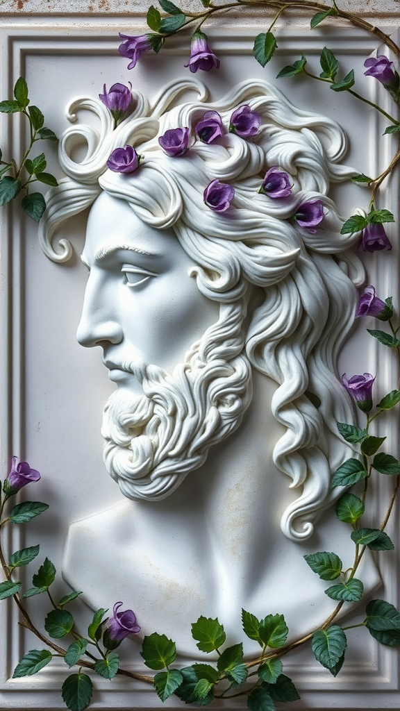 Plaster relief of Orpheus, purple irises woven into his hair, Ionic order, soft lavender mist in the background, verdant foliage curling around the frame, monochromatic palette