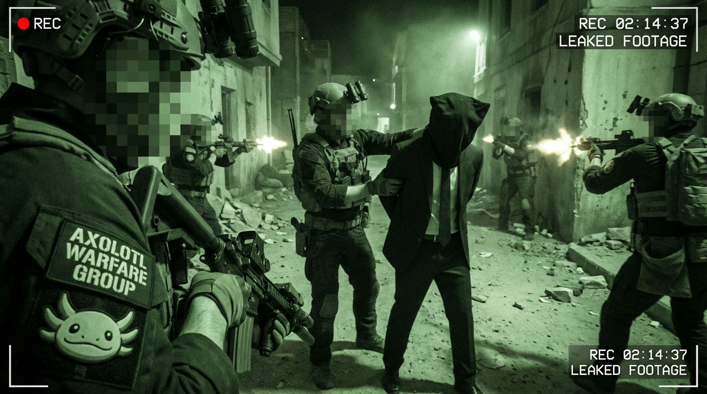 a ruthless PMC group "Axolotl Warfare Group" that bear the insignia of a cute axolotl face but with professional looking text, that is equipped with the latest gear, their faces blurred out with mosaic face censor, leaked helmet cam of them in action performing blackops with a captured VIP wearing a suit and a black bag over his head (no eye holes), during a hot exfil under fire and returning fire , night vision filter