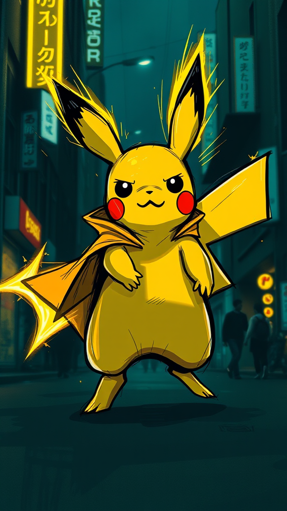pokemon pikachu, dynamic stance, anime influence, sketch style, nvinkpunk aesthetics, abstract brushwork, bold lines, HDR Neo-Noir vibe, luminous yellow neon, minimalist composition, enchanting demon from the underworld, blazing cloak, flawless symmetry, Cyberpunk Edgerunner vibe, nighttime urban setting, fiery breath, chilly disorder, stark contrast, afar perspective, ultra-high definition, flickering effect, gentle imagery, inspired by loish and jeremy mann, full-body depiction, character schematic, electric wave, 3D rendering, computer-generated visuals, radiant neon, cyberpunk feel, distorted perspective, detailed hand anatomy, unconventional mood.