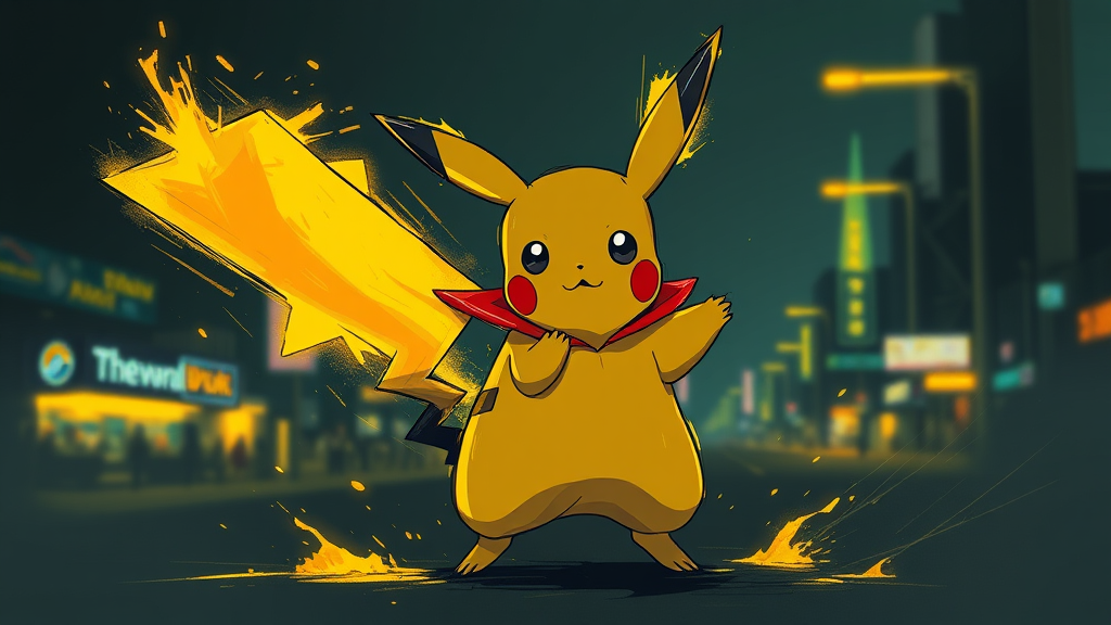 Pokemon Pikachu, dynamic stance, anime style, sketch, nvinkpunk, abstract brush strokes, bold lines, HDR Neo-Noir style, vibrant yellow neon, minimalist, captivating devilish flair, blazing cloak, ideal proportions, Cyberpunk Edgerunner vibe, late night ambiance, breath of fire effect, cool chaos, stark contrast, distant perspective, 8K clarity, flicker effect, delicate portrayal, loish influence, Jeremy Mann inspiration, full figure depiction, character sheet, electrifying wave, 3D, CG graphics, radiant neon, cyberpunk aesthetic, imperfect-hands motif, female figure.