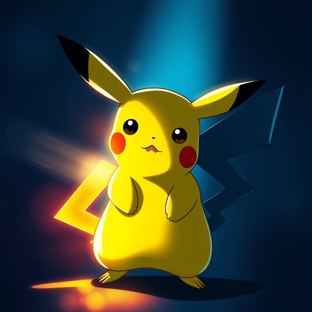 pokemon wallpaper featuring Pikachu with an HD background, inspired by the chiaroscuro technique and the distinctive style of Suehiro Maruo, showcasing energy-filled illustrations. The composition embraces cartoon realism with an overexposure effect and draws influence from Magali Villeneuve's luminous shadowing, resulting in a dramatic interplay of light and shadow across the scene. The aspect ratio is unique, presenting a tall and narrow format, enhancing the dynamic presentation of Pikachu illuminated with artistic flair.