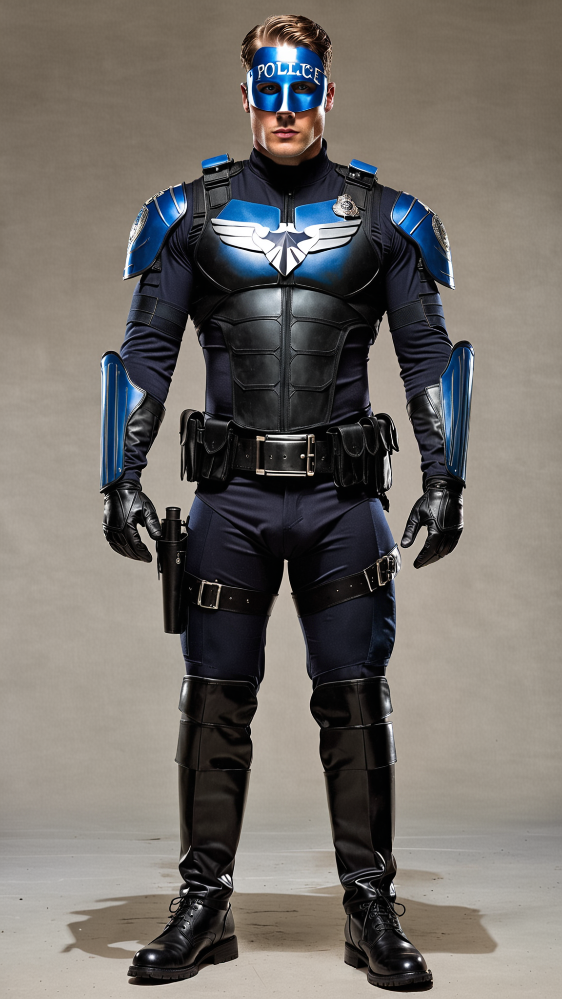 Policeman becomes Super-hero. Caucasian male, blue eyes, handsome. Tall, muscular, fit. He wears a full black spandex outfit with blue stripes down the sides of the pantlegs, blue stripes down the sides of the arms, a blue collar around the neck and large blue gloves over his forearms. His head is covered by a black skull-fitting mask that has openings for his eyes, nose and mouth. It helps to keep his secret identity. A tiny blue shield is on the forehead of the mask. He has a tactical belt around his waist with all the things a policeman would need--- gun, holster, walkie-talkie, and other assorted items. There is a huge silver badge graphic on the chest of the uniform, signifying that he is a policeman. His outfit is completed with black knee-high biker boots-- he does ride a police motorcycle on occasion. He carries a big black knightstick and a huge silver shield in the shape of a badge, these are his weapons of choice. Full body pose, carrying his knightstick and shield to protect the city.