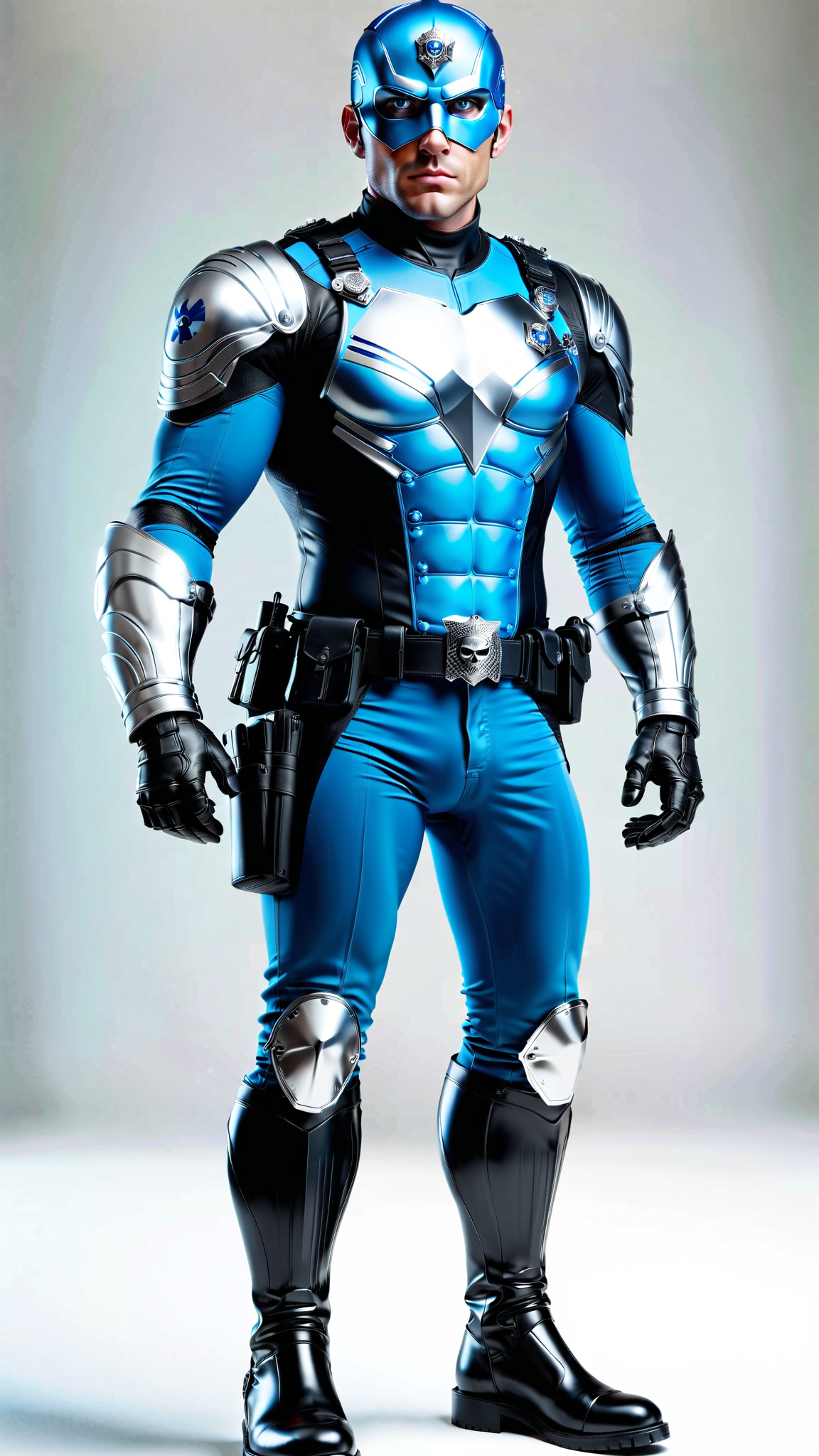 Policeman becomes Super-hero. Caucasian male, blue eyes, handsome. Tall, muscular, fit. He wears a full black spandex outfit with blue stripes down the sides of the pantlegs, blue stripes down the sides of the arms, a blue collar around the neck and large blue gloves over his forearms. His head is covered by a black skull-fitting mask that has openings, exposing his eyes and mouth. It helps to keep his secret identity. A tiny blue shield is on the forehead of the mask. He has a tactical belt around his waist with all the things a policeman would need--- gun, gun holster, walkie-talkie, and other assorted items. There is a huge silver badge graphic on the chest of the uniform, signifying that he is a policeman. His outfit is completed with black knee-high biker boots-- he does ride a police motorcycle on occasion. He carries a big black knightstick and a huge silver shield in the shape of a badge, these are his weapons of choice. Full body pose, carrying his knightstick and shield to protect the city.