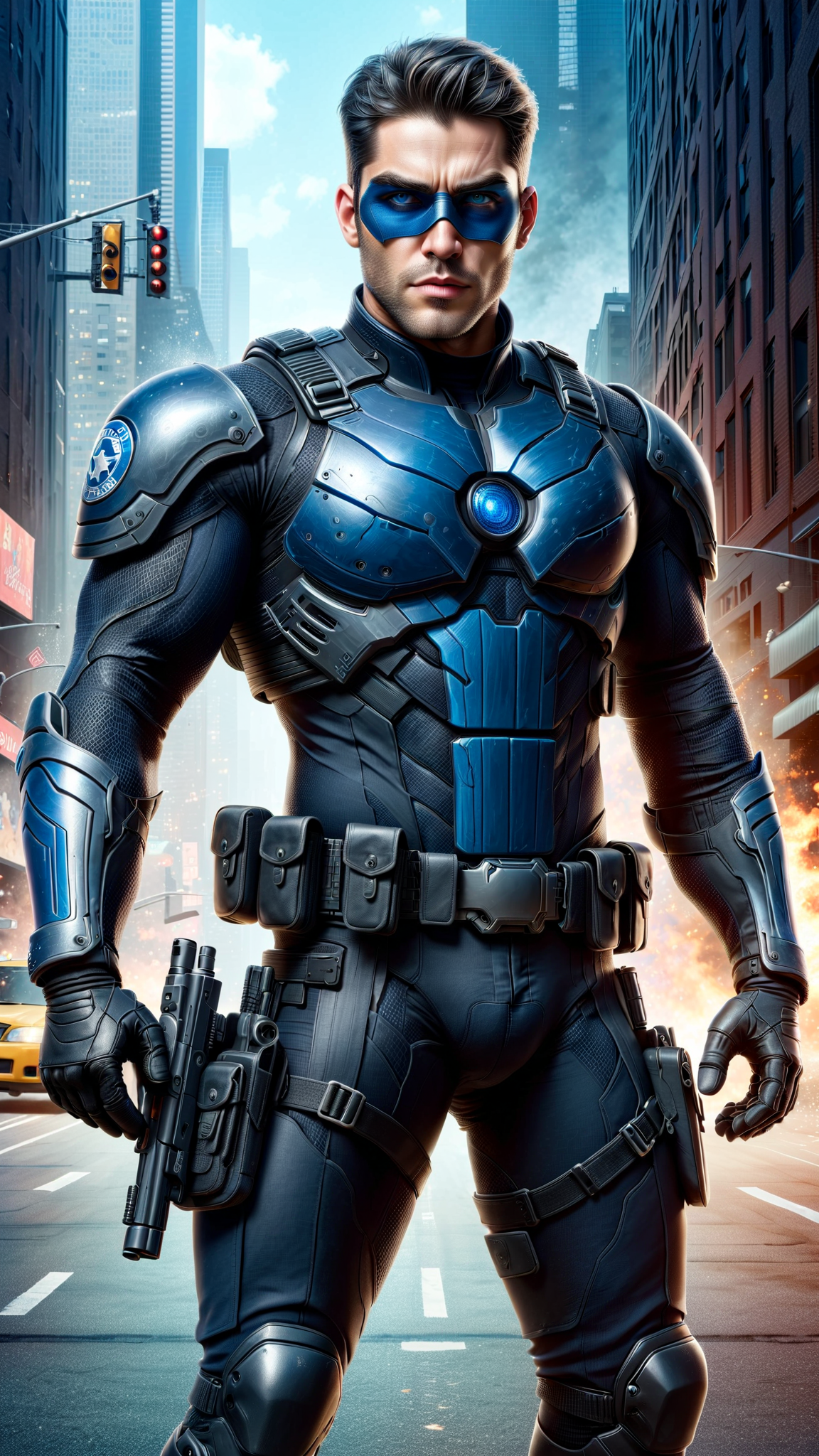 Policeman becomes Super-hero. Caucasian male, blue eyes, handsome. Tall, muscular, fit. He wears a full black spandex outfit with blue stripes down the sides of the pantlegs, blue stripes down the sides of the arms, a blue collar around the neck and large blue gloves over his forearms. His head is covered by a black skull-fitting mask that has openings, exposing his eyes and mouth. It helps to keep his secret identity. A tiny blue shield is on the forehead of the mask. He has a tactical belt around his waist with all the things a policeman would need--- gun, gun holster, walkie-talkie, and other assorted items. There is a huge silver badge graphic on the chest of the uniform, signifying that he is a policeman. His outfit is completed with black knee-high biker boots-- he does ride a police motorcycle on occasion. He carries a big black knightstick and a huge silver shield in the shape of a badge, these are his weapons of choice. Full body pose, carrying his knightstick and shield to protect the city.