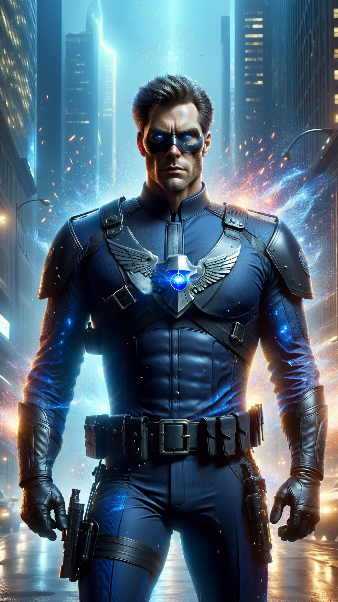 Policeman becomes Super-hero. Caucasian male, blue eyes, handsome. Tall, muscular, fit. He wears a full black spandex outfit with blue stripes down the sides of the pantlegs, blue stripes down the sides of the arms, a blue collar around the neck and large blue gloves over his forearms. His head is covered by a black skull-fitting mask that has openings, exposing his eyes and mouth. It helps to keep his secret identity. A tiny blue shield is on the forehead of the mask. He has a tactical belt around his waist with all the things a policeman would need--- gun, gun holster, walkie-talkie, and other assorted items. There is a huge silver badge graphic on the chest of the uniform, signifying that he is a policeman. His outfit is completed with black knee-high biker boots-- he does ride a police motorcycle on occasion. He carries a big black knightstick and a huge silver shield in the shape of a badge, these are his weapons of choice. Full body pose, carrying his knightstick and shield to protect the city.
