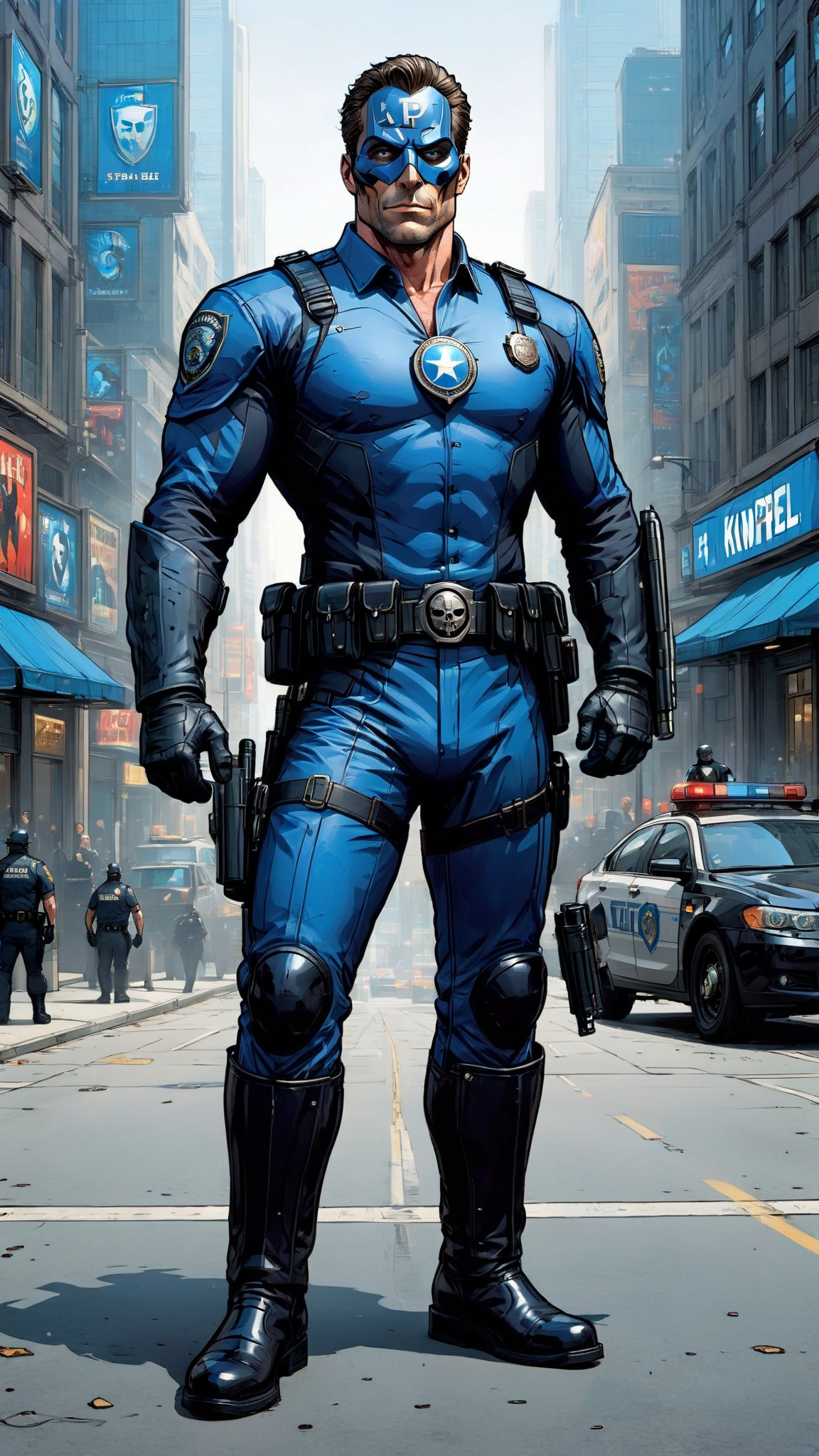 Policeman becomes Super-hero. Caucasian male, blue eyes, handsome. Tall, muscular, fit. He wears a full black spandex outfit with blue stripes down the sides of the pantlegs, blue stripes down the sides of the arms, a blue collar around the neck and large blue gloves over his forearms. His head is covered by a black skull-fitting mask that has openings, exposing his eyes and mouth. It helps to keep his secret identity. A tiny blue shield is on the forehead of the mask. He has a tactical belt around his waist with all the things a policeman would need--- gun, gun holster, walkie-talkie, and other assorted items. There is a huge silver badge graphic on the chest of the uniform, signifying that he is a policeman. His outfit is completed with black knee-high biker boots-- he does ride a police motorcycle on occasion. He carries a big black knightstick and a huge silver shield in the shape of a badge, these are his weapons of choice. Full body pose, carrying his knightstick and shield to protect the city.