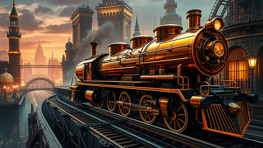 polished copper metallic steampunk locomotive on a magnificent railroad, intricate and highly detailed, dramatic cinematic lighting illuminating a retrofuturistic steampunk cityscape, elegant Victorian-inspired architecture with an expansive view, merging fantasy elements with biomechanical aesthetics, inspired by Jules Verne and H.G. Wells, showcasing a vibrant atmosphere, emphasizing a UHD, HDR, 8K visual experience, subtle creative touches enhance the scene, capturing a world of whimsy and invention.