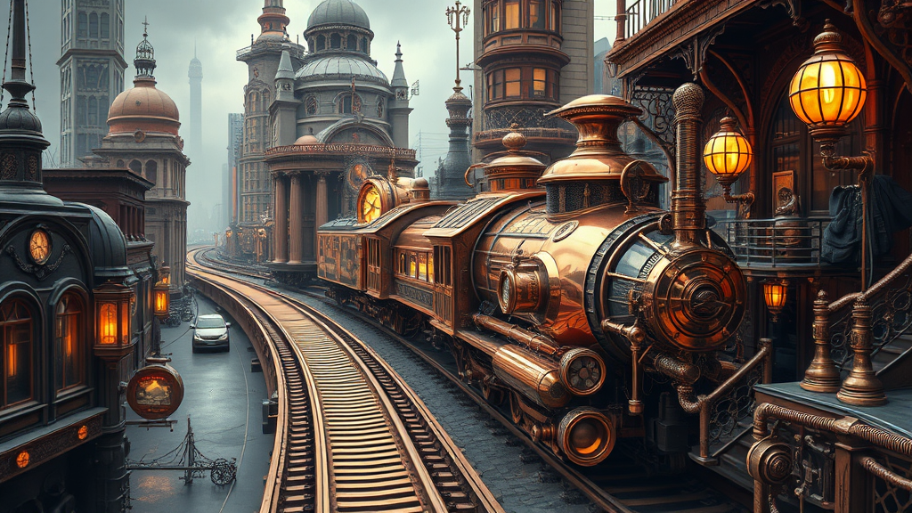 polished copper steampunk railroad, high detail, cinematic lighting, retrofuturistic cityscape, ornate Victorian architecture, biomechanical elements, inspired by Lady Mechanika, fantasy ambiance, Jules Vernesque and H.G. Wellsian influences, UHD clarity, HDR enhancement, 8K resolution artistry, atmospheric blend of metallic and urban aesthetics, intricate design with creative twists.