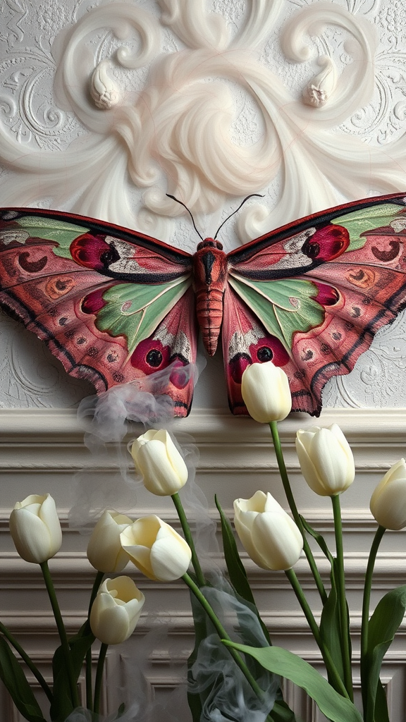 Polyphemus moth, wings unfurled revealing intricate baroque patterns, vivid raspberry and sage hues, reminiscent of Caravaggio, ethereal and hauntingly captivating, minimalist elegance, blooming white tulips, swirling liquid smoke forming fractals, textured plaster backdrop with classic wainscoting, evoking Loretta Lux, essence of opulent decay.