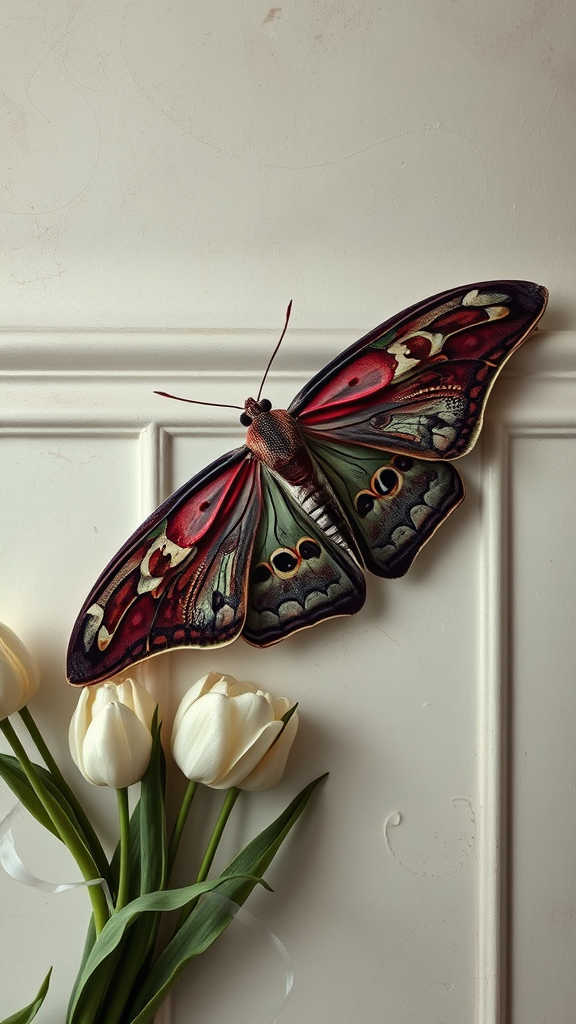 Polyphemus moth with elegantly spread wings, intricate baroque details, finely sharp accents, in hues of raspberry and sage, reminiscent of Caravaggio, creating a dreamy, hauntingly beautiful atmosphere. Minimalist composition with blooming white tulips and swirling liquid smoke fractals. Set against a plaster backdrop adorned with wainscoting panels, evoking the essence of Loretta Lux and a sense of decadent decay.
