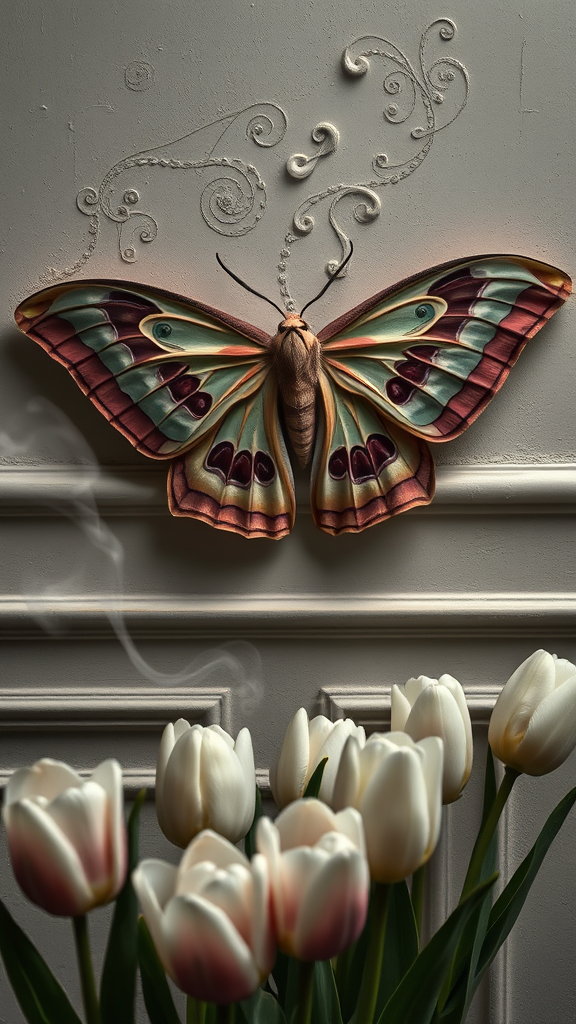 Polyphemus moth with wings unfurled, featuring intricate baroque patterns, captured in sharp detail, hues of raspberry and sage intertwining, reminiscent of Caravaggio, dreamy and hauntingly beautiful in essence, minimalist yet profound. In the foreground, white tulips begin to blossom, surrounded by subtle wisps of liquid smoke resembling fractals. The backdrop is a textured plaster with elegant wainscoting panels, exuding a Loretta Lux-inspired aura of decadent decay.