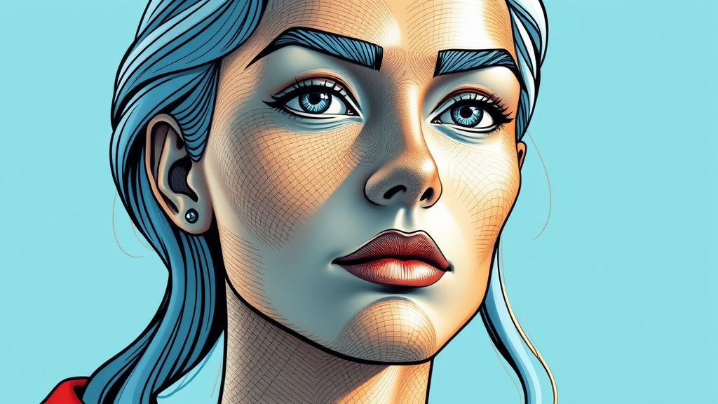 Pop art-inspired 3D doodle art portrait, featuring interference patterns with a light sky-blue and bronze color scheme, showcasing realistic hyper-detail with intricate engraved line-work, reminiscent of a graphic novel style. The composition emphasizes elongated proportions --with a vertical aspect ratio of 63:128-- and demonstrates a high degree of stylization, merging classic comic elements with a modern aesthetic.