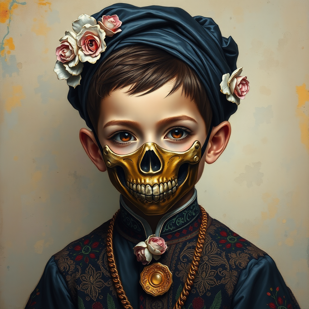 Pop surrealism painting depicting a puzzle-like boy adorned in a David Alejandro-inspired skull mask, radiating childlike innocence and charm. Rendered in oil on panel with a flowerpunk aesthetic, the artwork features a dark navy and light bronze color palette. Traditional costumes add depth, embodying the essence of women artists, with subtle creative modifications enhancing the scene's intriguing allure and whimsical atmosphere.