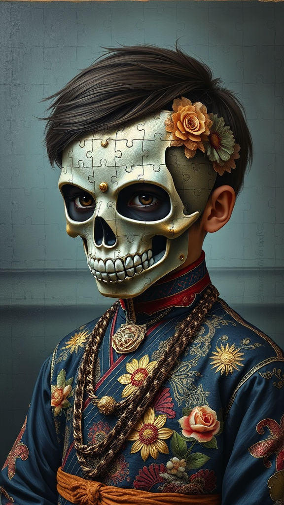 Pop surrealism painting of a boy composed of interlocking puzzle pieces wearing a David Alejandro-inspired skull mask, capturing childlike innocence and whimsical charm; executed in oil on panel. The scene blends flowerpunk aesthetics with a palette of deep navy and shimmering light bronze. The boy is adorned in traditional costumes, infused with feminine artistry and vision, offering a unique perspective.