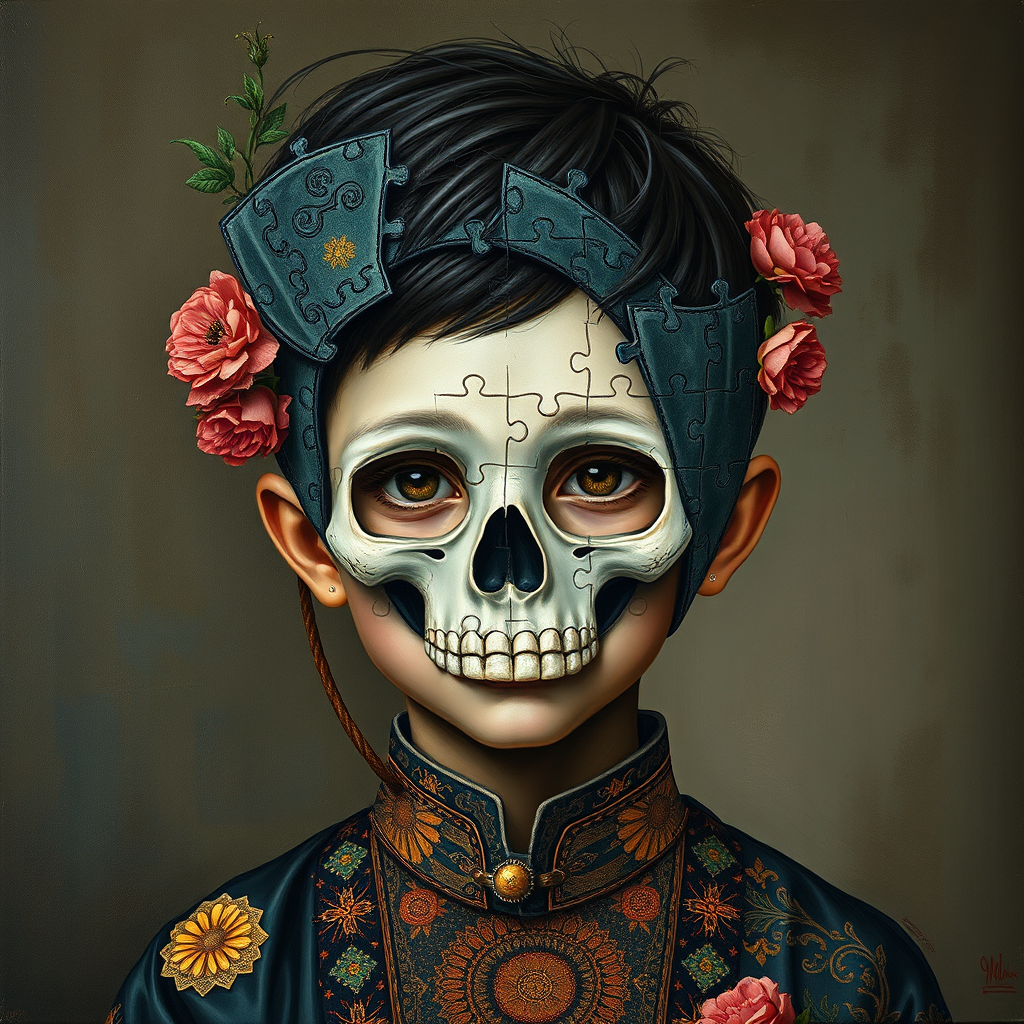 Pop surrealism painting of a boy composed of puzzle pieces wearing a David Alejandro-style skull mask, exuding childlike innocence and charm, painted in oil on panel, infused with a flowerpunk aesthetic, featuring a palette of dark navy and light bronze, traditional costumes inspired by cultural folklore, crafted in the distinctive style of women artists.