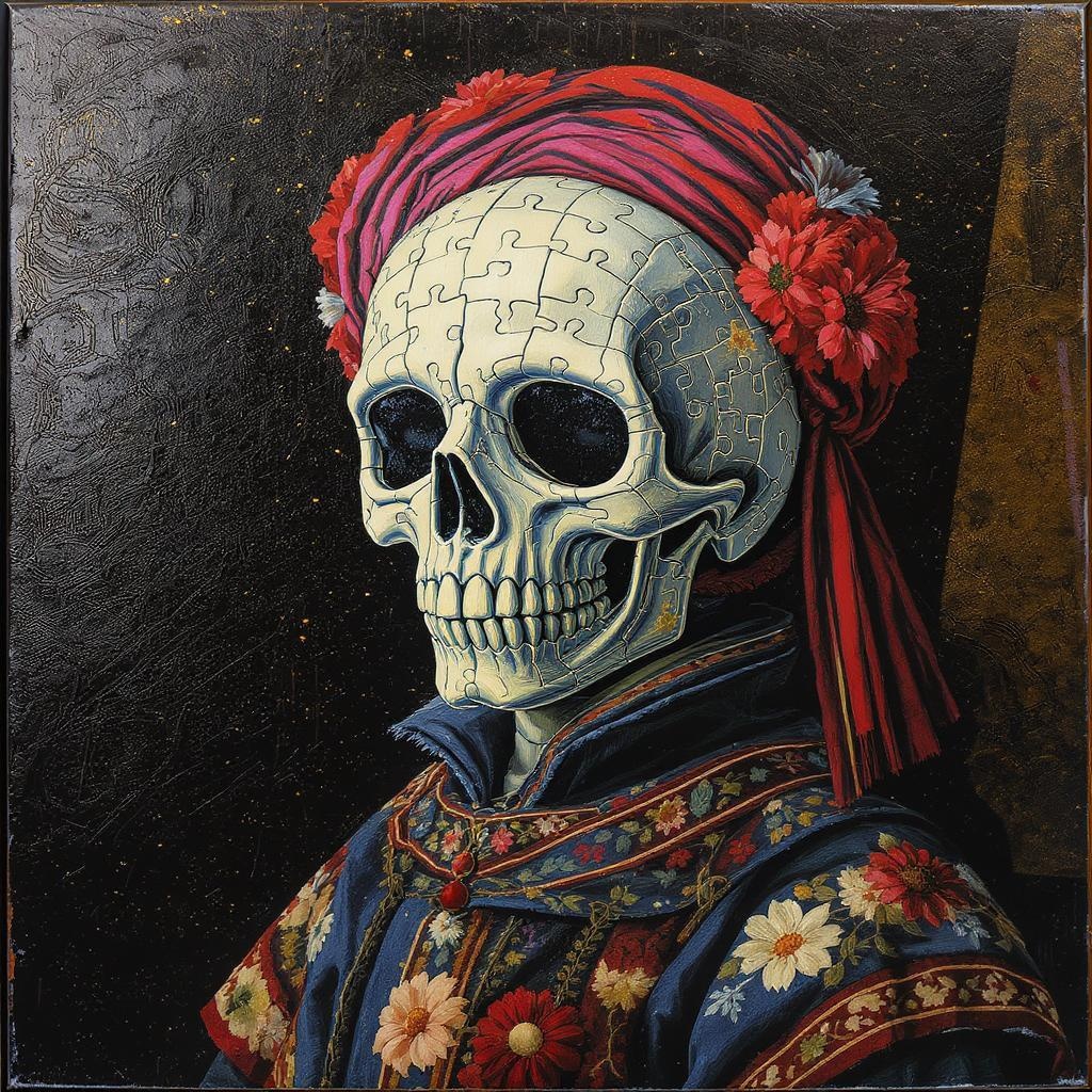 Pop surrealism painting of a boy composed of puzzle pieces wearing a David Alejandro skull mask, embodying childlike innocence and charm, oil on panel. Infused with flowerpunk elements, the artwork features a palette of dark navy and light bronze. The scene is enriched with traditional costumes, highlighting the influence of women artists.