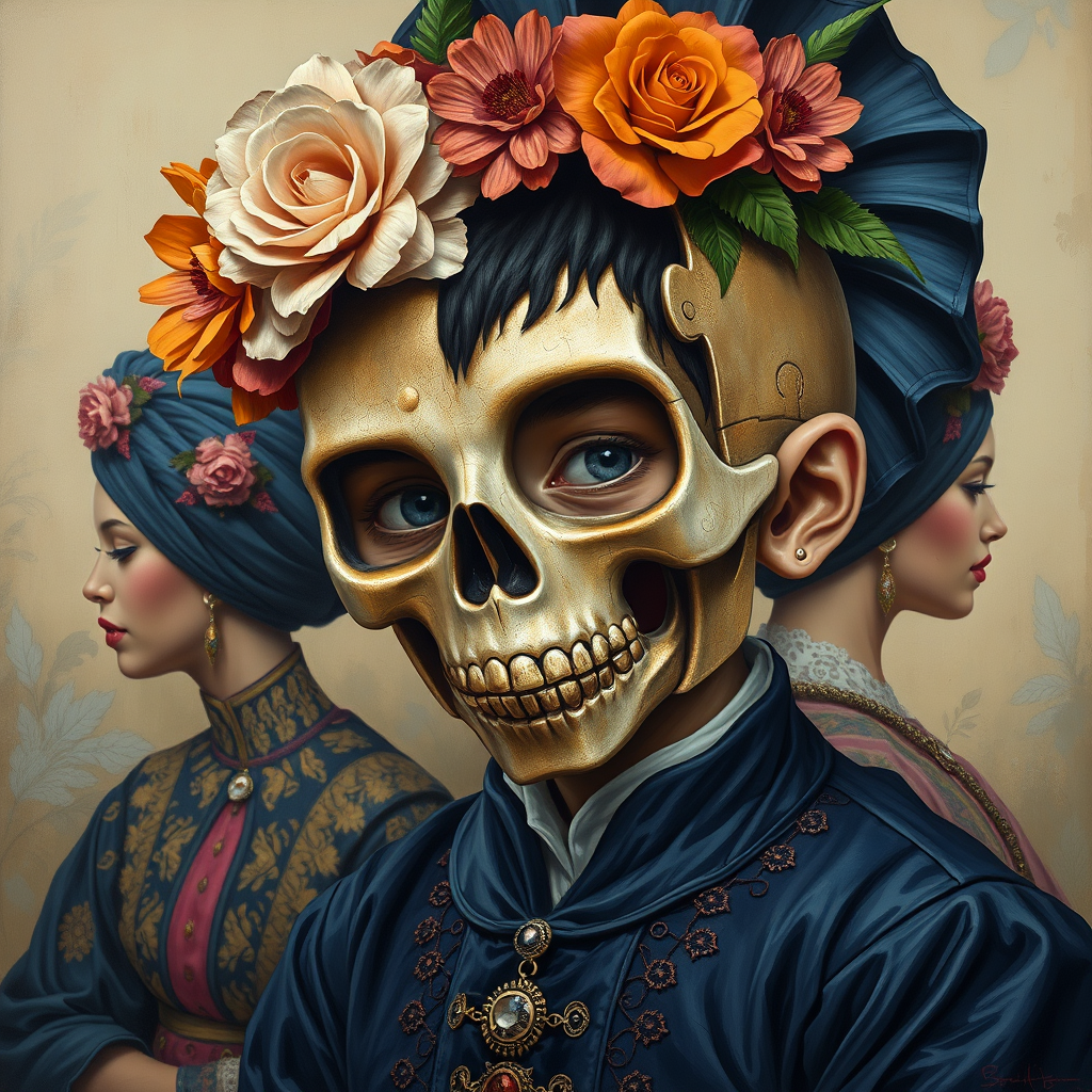 Pop surrealism painting of a puzzle-formed boy wearing a whimsical skull mask inspired by David Alejandro, encapsulating a sense of childlike innocence and charm. Rendered in oil on panel, the artwork embraces a flowerpunk aesthetic with a palette dominated by dark navy and light bronze hues. The scene features traditional costumes, with women artists contributing to the rich tapestry of the composition.