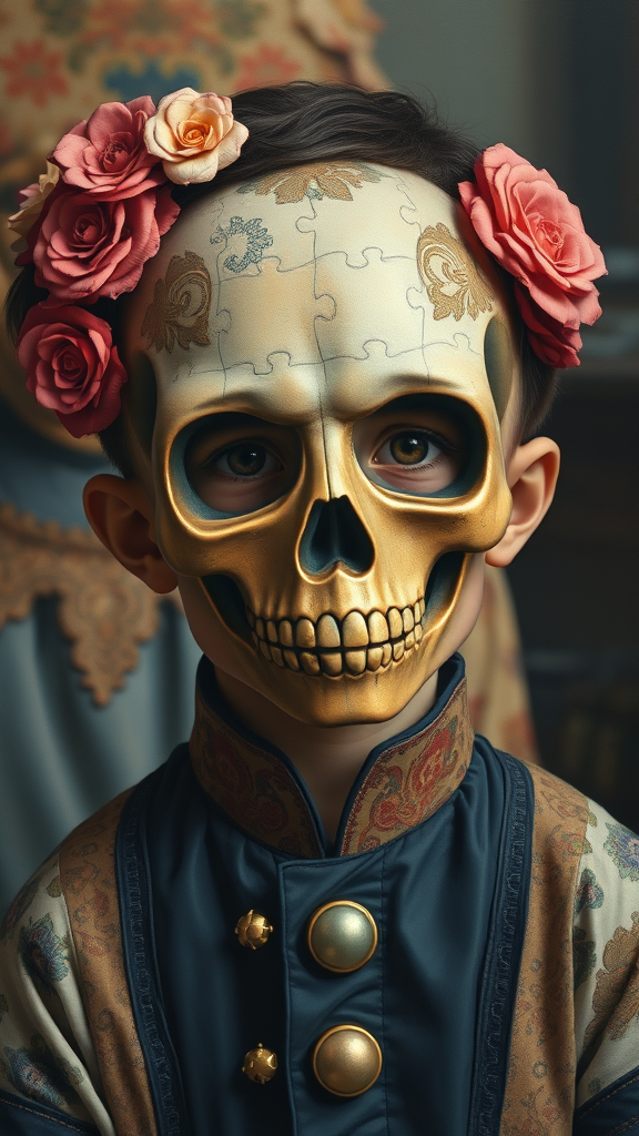 Pop surrealism painting of a puzzle-piece boy adorned with a skull mask reminiscent of David Alejandro, infused with childlike innocence and appeal, oil on panel. Incorporating elements of flowerpunk, the piece features a palette of dark navy and light bronze. Set against a backdrop of traditional costumes, it celebrates the unique touch of women artists, merging whimsy with a hint of mystery.