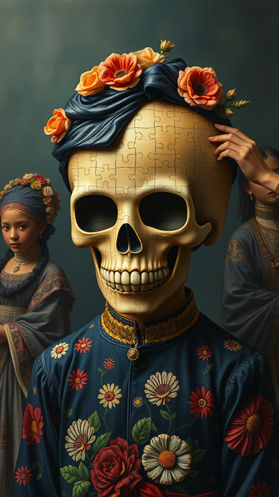 Pop surrealism painting of a puzzle-piece boy wearing a David Alejandro-inspired skull mask, evoking childlike innocence and charm. The scene, painted in oil on panel, features a flowerpunk aesthetic with a palette of dark navy and light bronze. The boy is surrounded by figures in traditional costumes, captured through the lens of women artists, adding a unique touch to the composition.