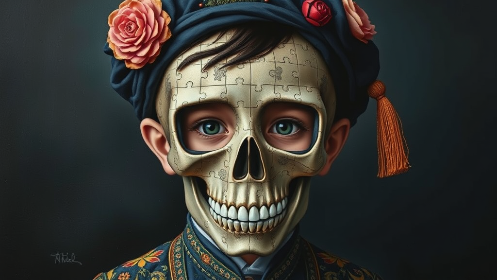 pop surrealism painting of a puzzle-piece boy wearing an intricately designed skull mask, exuding childlike innocence and charm, oil on panel, combining elements of flowerpunk, featuring a dark navy and light bronze color palette, traditional costumes inspired by cultural heritage, created in the style of a renowned woman artist's whimsy and imagination