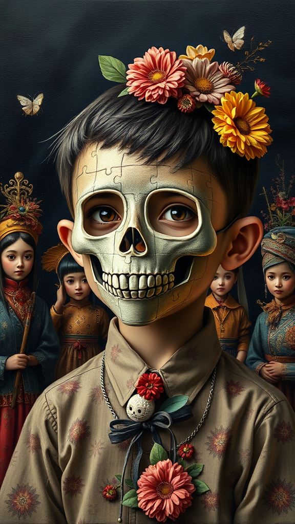 Pop surrealism painting of a puzzle-piece boy wearing a stylish mask inspired by David Alejandro's skull design, capturing the essence of childlike innocence and charm. Rendered in oil on panel with a flowerpunk aesthetic, the scene is enveloped in rich dark navy and light bronze hues. The boy is surrounded by figures in traditional costumes, each crafted with an eye for whimsical detail, reflecting the unique touch of women artists. The composition is lively and imaginative, breathing life into a dreamlike world where the ordinary becomes extraordinary.