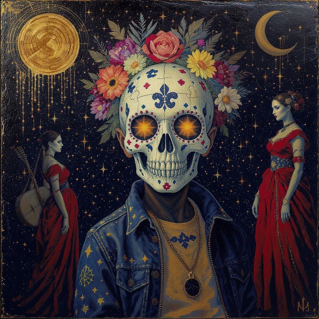 Pop surrealism painting of a puzzle-piece boy wearing a skull mask with designs similar to David Alejandro's, capturing childlike innocence and charm, painted in oil on panel. The scene has a flowerpunk aesthetic with a palette of dark navy and light bronze. The boy is surrounded by figures in traditional costumes, emphasizing the contributions of women artists. Subtle creative elements enhance the mystical and whimsical atmosphere.
