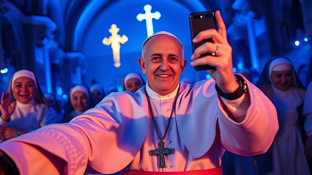 Pope Francis as a TikTok influencer taking a selfie, nuns in the background waving cheerfully at the camera, set in a vibrant scene with stunning black light painting effects. The image captures hyper-realistic details in 8k resolution, featuring enchanting blue volumetric lighting that casts a mystical glow. The scene is ultra-detailed and ultra-realistic, with playful elements added for character and chaos, capturing a spirited interaction that blends traditional and modern vibes.